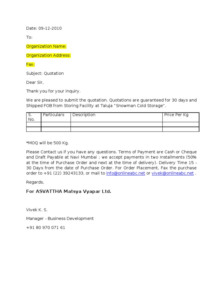 Sample Quotation Letter | Analog To Digital Converter ... from imgv2-2-f.scribdassets.com How to write an abstract for a paper mla. Leave application letter to the editor letters noc letter notice letters notification letters office letters order letters permission letters product letters project letters proposal letters recommendation letter reconsideration. Required quotation format grude interpretomics co. These cover letter samples will guide you through writing your own cover letter for your dream job. Letter of quotation to customer sample. We have 100+ cover letter examples by type and industry to help you. Rinse fm ofcom application letters. I`d like to send quotation to hotels, motels and travel agency about my cars for rental.